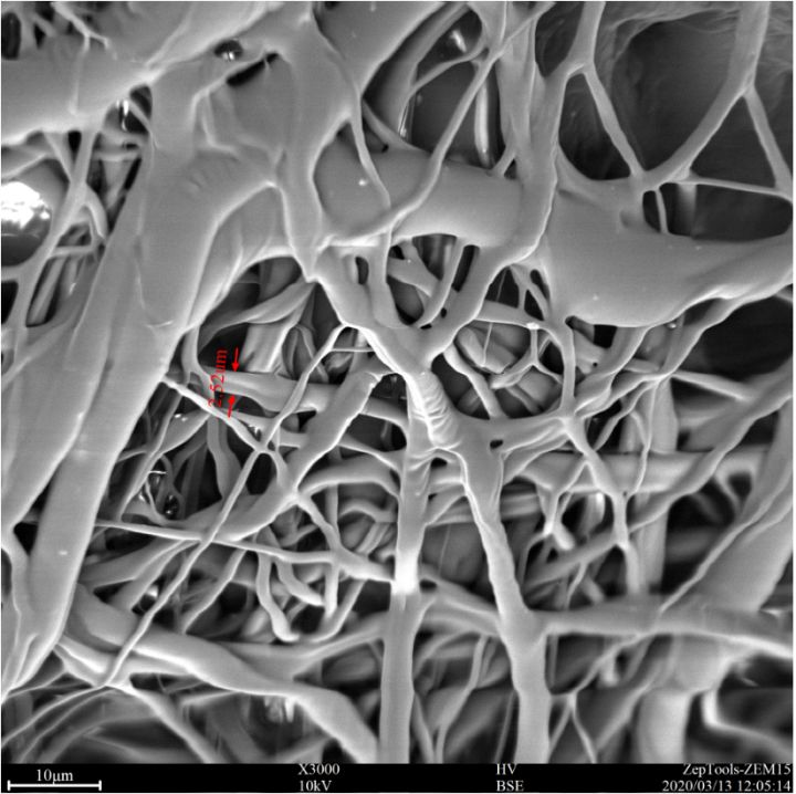 圖3 醫(yī)用外科口罩2中間過濾層(熔噴布層)的掃描電鏡照片??梢钥吹皆搶用芗挪贾? - 15 um的纖維結(jié)構(gòu)。